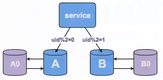 线上数据库,我们为了保持其高可用,一般都会每台主库配一台从库,读写在主库,然后主从同步到从库。如下,A,B是主库,A0和B0是从库。