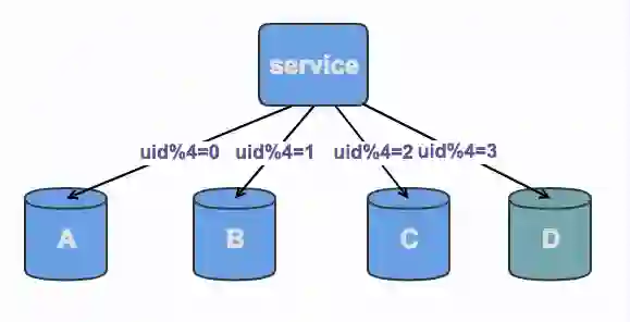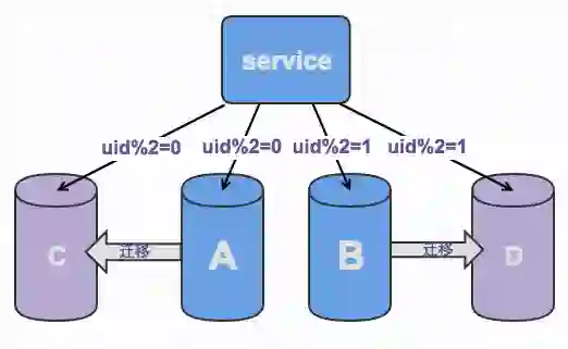 不过此时由于分片规则进行了变化(uid%3 变为uid%4),大部分的数据,无法命中在原有的数据库上了,需要重新分配,大量数据需要迁移。
