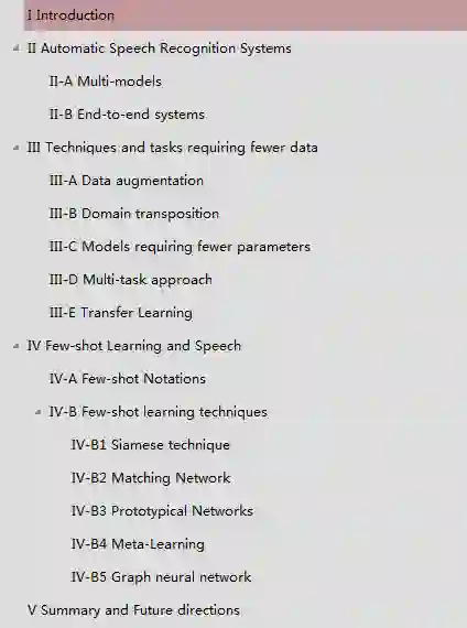 大多数语音系统都在使用深度神经网络(DNN),这些系统需要学习大量数据。因此,在资源匮乏的语音语言/问题下学习最新的框架是一项艰巨的任务。问题可能是语音受损的数据量有限。此外,获取更多的数据和专业知识既费时又昂贵。在本文中,我们将自己定位以下语音处理任务:自动语音识别,说话人识别和情感识别。为了解决数据有限的问题,我们首先研究了最先进的自动语音识别系统,因为它代表着最艰巨的任务(由于每种语言的差异性很大)。接下来,我们概述需要较少数据的技术和任务。在上一节中,我们研究了镜头不足的技巧,因为我们将资源不足的语音解释为镜头不足的问题。从这个意义上讲,我们提出了一些少拍技术的概述,以及在这项调查中针对焦点语音问题使用这种技术的观点。可能是所审查的技术不适用于大型数据集。