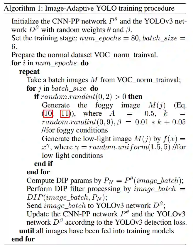 IA-YOLO以端到端的方式学习CNN-PP和YOLOv3,这确保CNN-PP可以学习适当的DIP,以弱监督的方式增强图像进行检测。