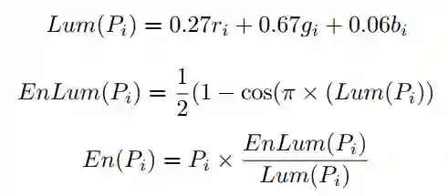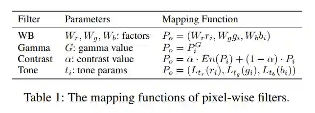 像素级滤波器映射一个输入像素值 转换为输出像素值 ,其中 分别表示红、绿、蓝三个颜色通道的值。表1列出了四个像素级过滤器的映射函数,其中第二列列出了在本文的方法中要优化的参数。WB和Gamma是简单的乘法和功率变换。显然,它们的映射函数对于输入图像和参数都是可微的。