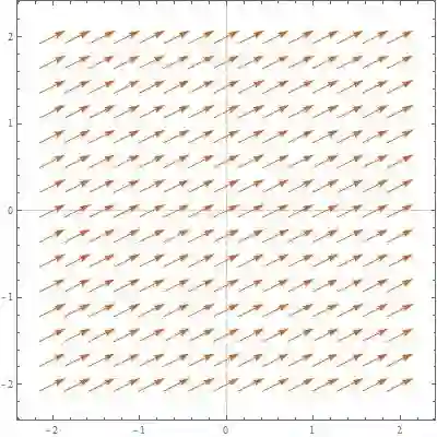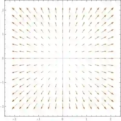 下面这个向量场中的向量同时有两个分量, 其实就是从原点呈放射状, 并且向量大小随着与原点的距离增大而增大.