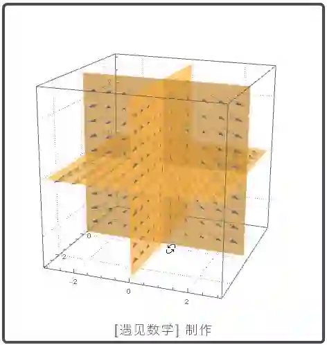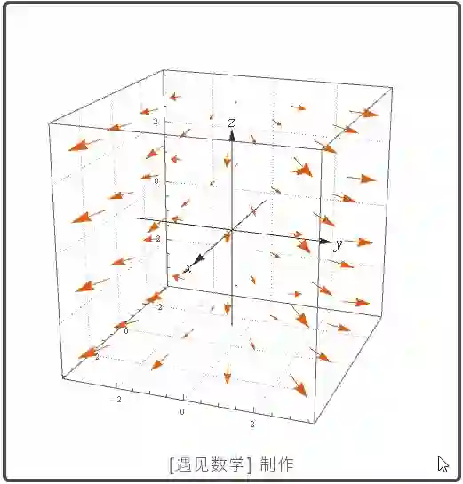 一旦我们理解平面的情况, 我们就可以来看三维的向量场图, 在空间中的每一点处都有一个向量. 每个有x,y,z三个分量表示出来, 其中每个分量都是 x,y,z 的函数.