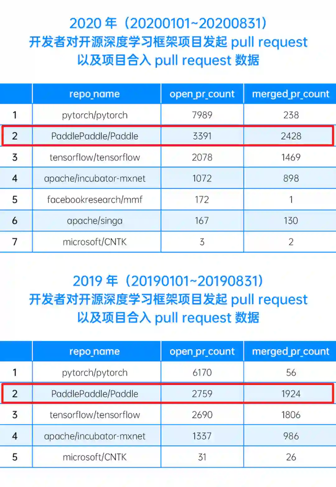 InfoQ 通过分析 GitHub 开源项目数据集 GitHubArchive 之中关于 pull request 的发起和合入数据,获得了 2020 和 2019 年度全球深度学习框架活跃度排名榜单,其中,百度飞桨的 open 数据由去年的 2759 次跃升到今年同期的 3391 次,比现阶段暂列第三的谷歌 Tensorflow 高出 1000 多次。飞桨的 merged 数据由 1924 次跃升为 2428 次,力压暂居第一 Pytorch 的 238 次,比第三名 Tensorflow 高出近 1000 次,这也意味着“动静统一、软硬融合”的飞桨一直在致力于让深度学习技术的创新与应用更简单,其提供的 AI 底层技术也深受开发者欢迎。