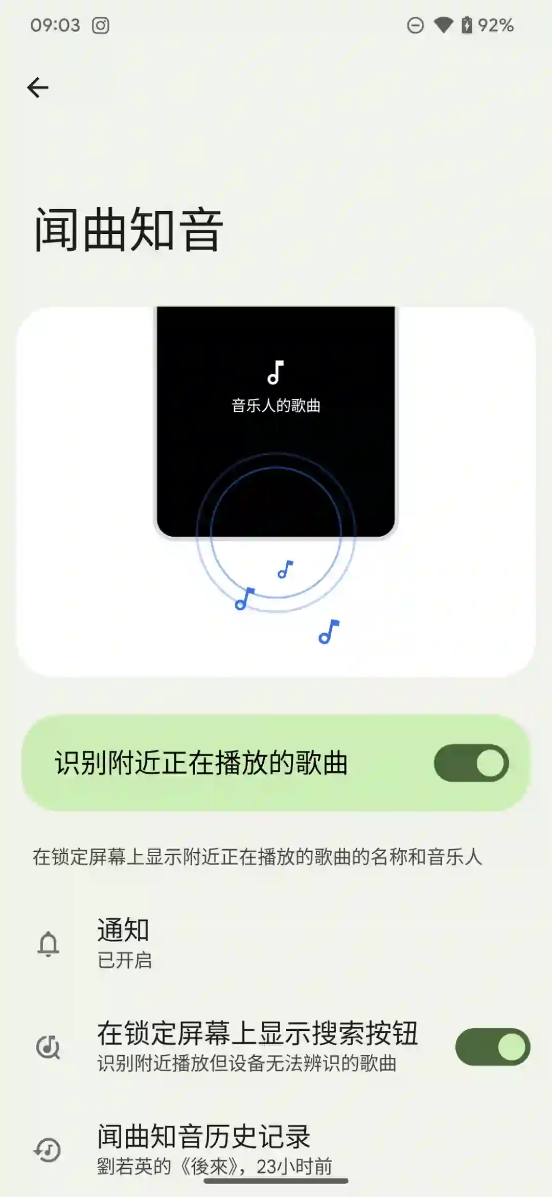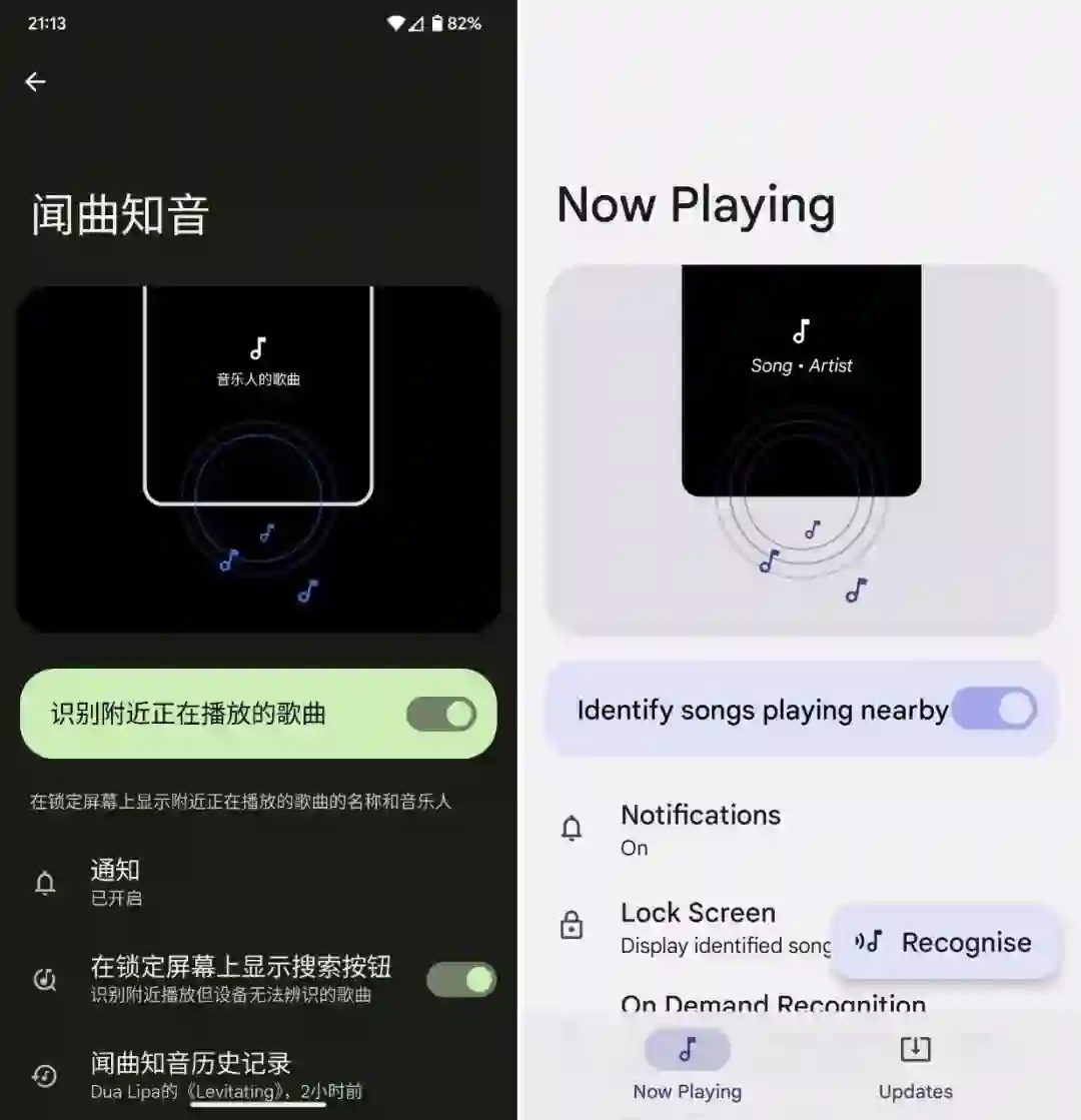 主界面「Now Playing」则是我们使用和设置的功能入口,同时也集成了 Pixel 官方刚刚更新的手动触发识别按钮。