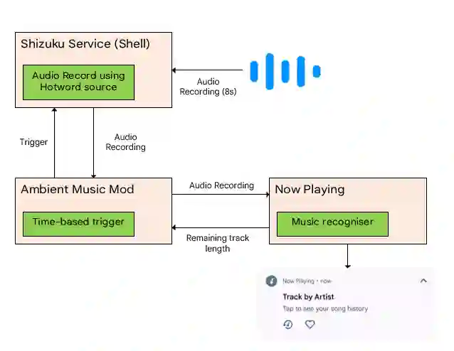 由于识别模型是针对特定 DSP 硬件开发,它难以适配到其他手机上。根据 AMM 开发者的描述,这种音乐识别模型只是「判断音乐」而不是「检测音乐」,所以他另辟蹊径,绕过了 DSP 模型判断,直接让 AMM 定时触发并将结果注入到监测过程当中,再通过热词权限进行录音、递交至修改版的「Android System Intelligence」(即之后安装的「闻曲知音」应用),然后执行与 Pixel 相同的识别过程。这种方式存在一定劣势,那就是无法精确感知音乐的开始和结束,所以才有了刚才提到的识别间隔、缓冲时长以及亮屏触发等设置选项。