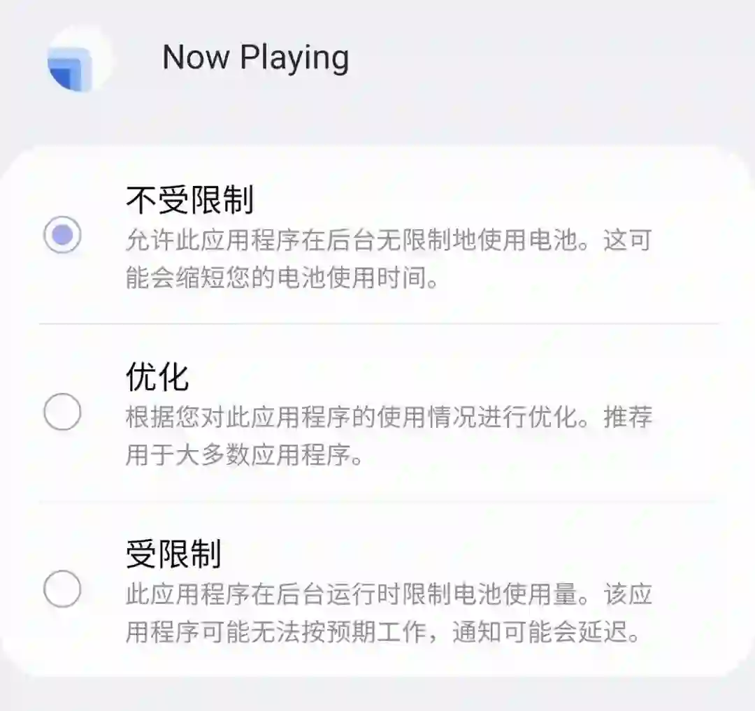 :我们在第一次使用 AMM 时一切正常,但过一段时间发现 AMM 不会在后台进行识别了,此时我们第一反应是通过手动识别进行测试;如果手动识别时应用多次提示录制失败,或者是卡在录制启动的 Loading 画面,我们就要去检查 App 的应用权限和后台电池优化选项是否正常,别忘了还有一个「闻曲知音」,因为它才是真正执行音频识别任务的那个主角。