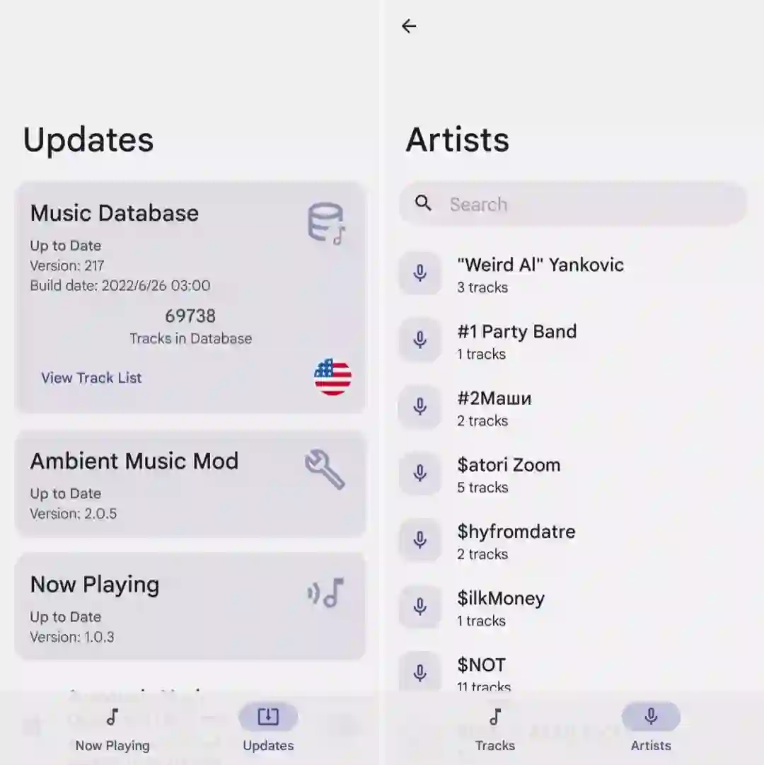 细心的你一定会发现,AMM 相比 Pixel 原生功能增加了一个「Updates」,在这里我们不仅可以查看已安装组件版本,还能切换、浏览和搜索离线曲库内容,甚至还根据歌手和专辑进行了分类。关于曲库操作的这些功能,可是连 Pixel 官方都没有提供(与此同时,Pixel 用户正在为切换曲库地区而愁容满面)。