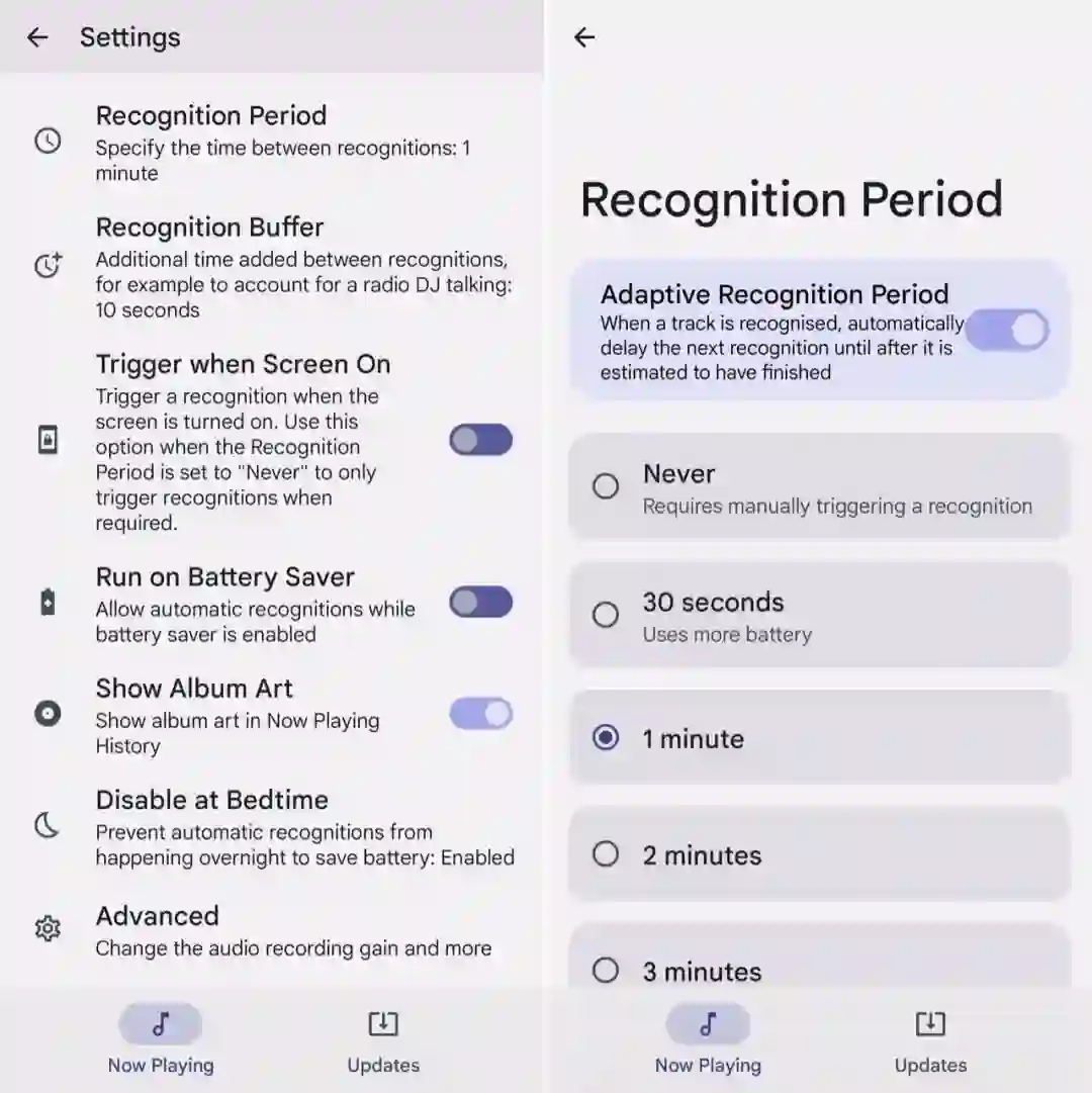 为了平衡续航和识别功能,AMM 并不是一直在录制和识别周围的背景音频,而是每间隔一段时间就启动一次录制识别,用户可以在设置中通过「Period」和「Buffer」选项来调整识别间隔以及缓冲时长。过短的时间间隔能够让识别更加灵敏,但也会带来更高的能耗,但时间过长也有可能错过广告插曲等背景音乐。如果你不希望 AMM 持续在后台监听音频,但又想尽快启动识别,可以使用「Trigger when Screen On」选项,这样只需要你在听到音频当下开启手机屏幕,AMM 将会被立即触发识别。