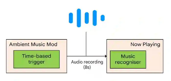 Google 对该功能进行了功能扩展,音乐识别模型就是通过热词方式来监听背景声音,如果判断背景声音是音乐,并且同时满足了多种条件(例如没有在拨打电话、设备自身没有在播放音乐等),则会录制 8s 音频转交给「Android System Intelligence」组件进行音乐识别,Now Playing 便是这个组件当中的一项功能。至于离线识别,其原理与在线识别相似,只是将筛选和压缩后的音频指纹库存储在本地。