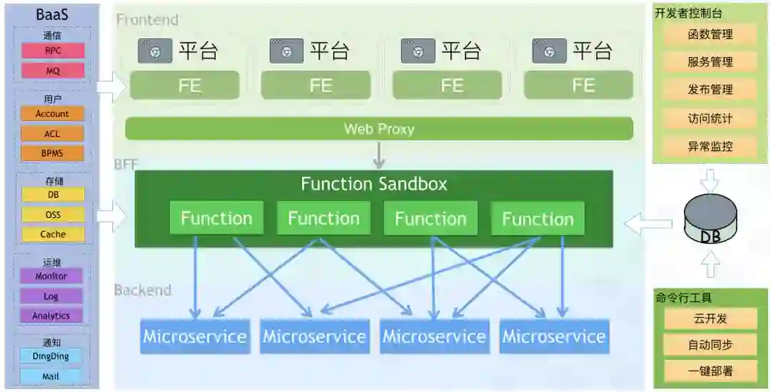 前端在使用 Serverless 服务时,亚顿认为最主要痛点在于基础设施的不完善。CNCF 针对 Serverless 给出了他们的定义:Serverless = FaaS + BaaS,然而目前大家主要还是聚焦在前者,对 BaaS 的关注度相对较少。虽然阿里有了一套完善的函数运行时,但真正的业务通常是无法通过一个纯函数的执行而中间不调用任何其它依赖(比如 RPC、DB、Cache、MQ 等)就能独立完成的。所以,亚顿团队花了大量的精力将相关依赖封装起来,形成一套统一的 BaaS SDK 供函数调用,使其能完成以往在 BFF 中能完成的所有工作。