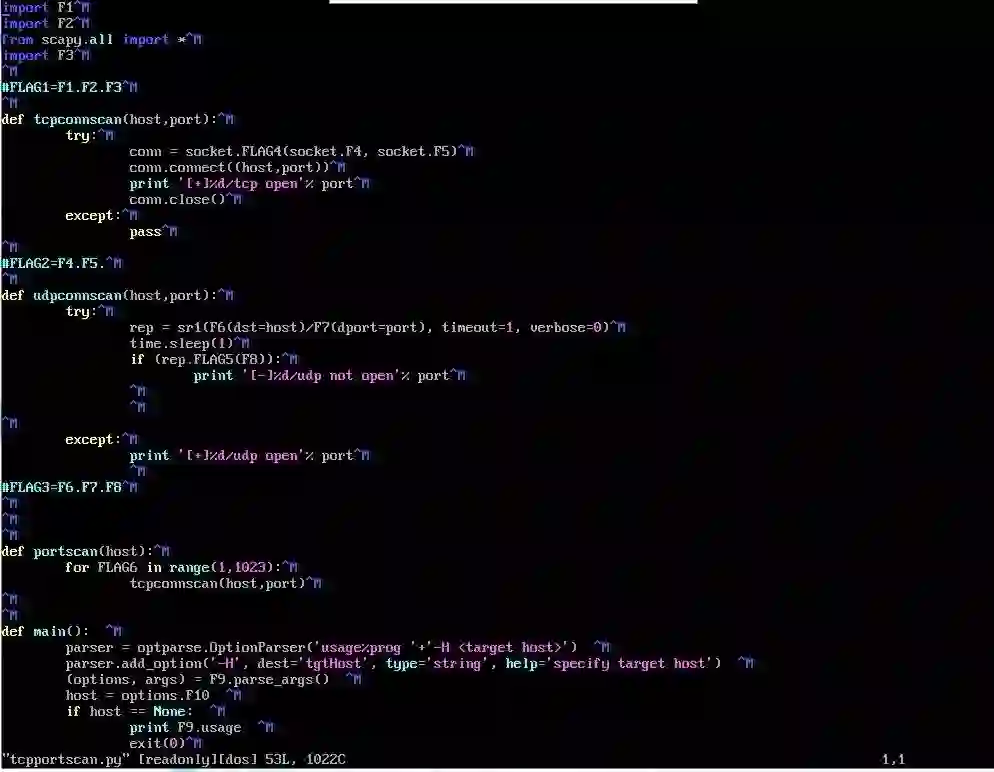 进入攻击机虚拟机操作系统Ubantu Linux32bit中的root目录,完善该目录下的tcpportscant.py文件,对目标HTTP服务器应用程序工作传输协议,端口号进行扫描判断,填写该文件当中空缺的FLAG1字符串,将该字符串作为FLAG值。