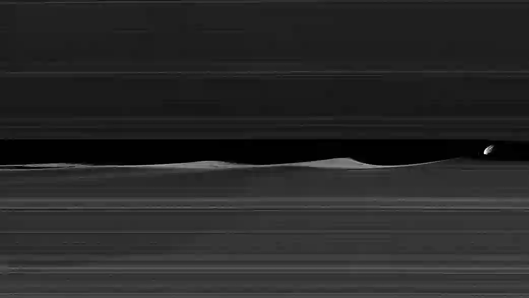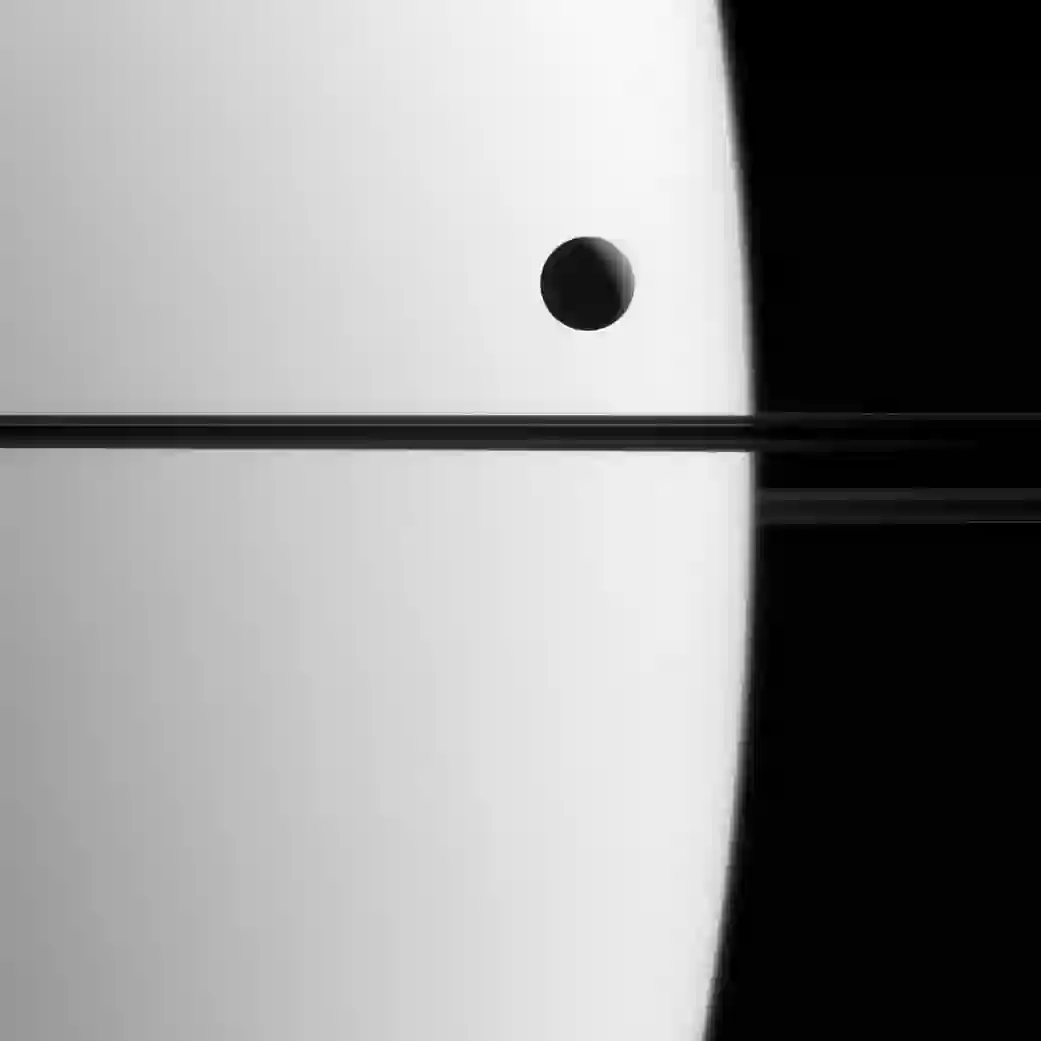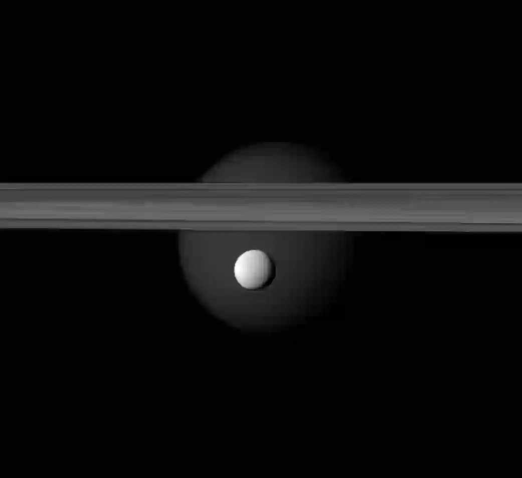 这个角度看来,土卫三陷在了A环与F环中间,如同叶子上的一滴露水