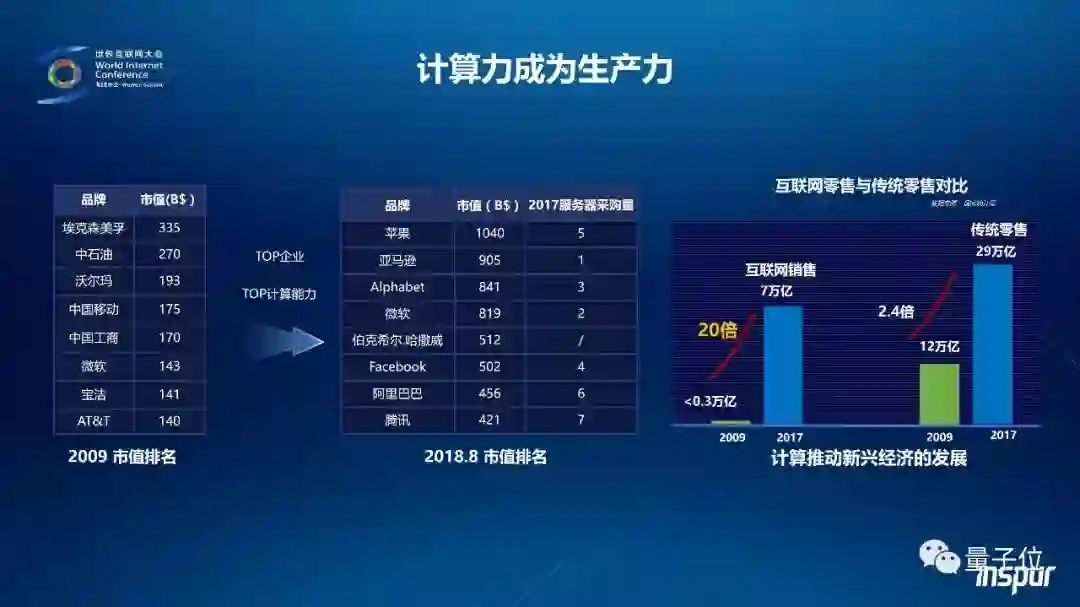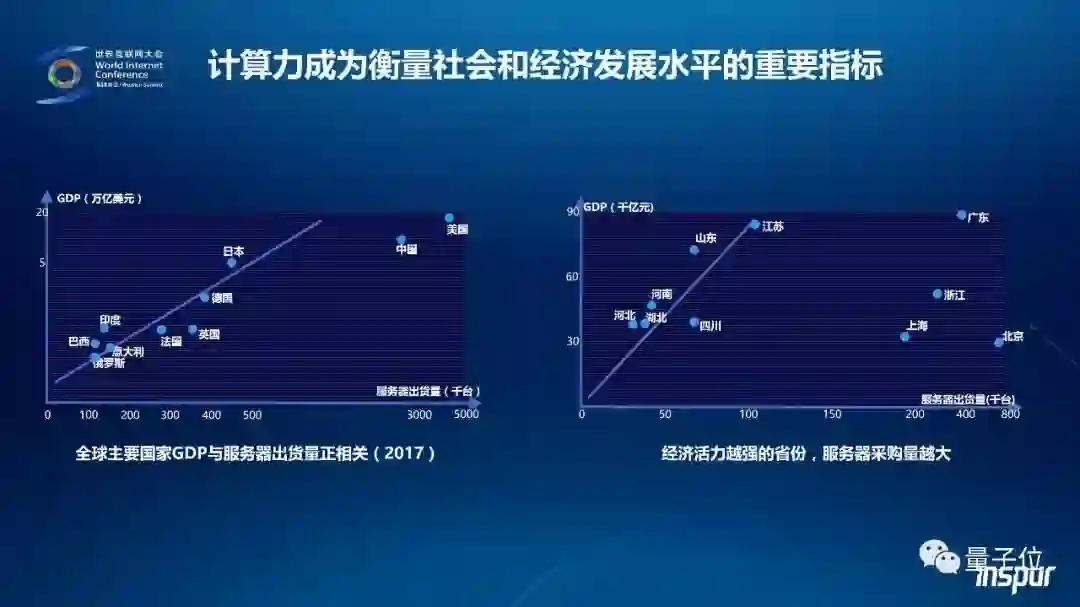 王恩东说,从技术上看,互联网对于经济的改变更多是计算对经济的改变,计算已经成为重要的社会生产力,成为衡量社会和经济发展水平的关键指标之一。首先,同一领域内,规模越大的公司服务器采购量就越大,例如,市值TOP7互联网公司也是服务器采购量的全球TOP7。其次,国家和地区的GDP规模与服务器出货量之间高度相关,甚至是线性相关,例如GDP与服务器出货量的前四位均为美国、中国、日本和德国。放眼国内,市场容量的地域分布与各省经济总量分布基本是正比例关系,上海、北京、浙江等发达地区每万亿GDP对应的服务器保有量远远高于全国平均水平。