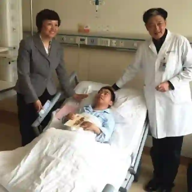 2016年,矣晓沅在医院进行手术,清华大学党委书记陈旭(左)到医院探望