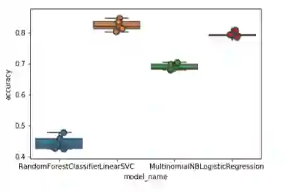 LinearSVC和Logistic回归比其他两个分类器执行得更好,LinearSVC具有轻微的优势,精度(median accuracy)约为82%。