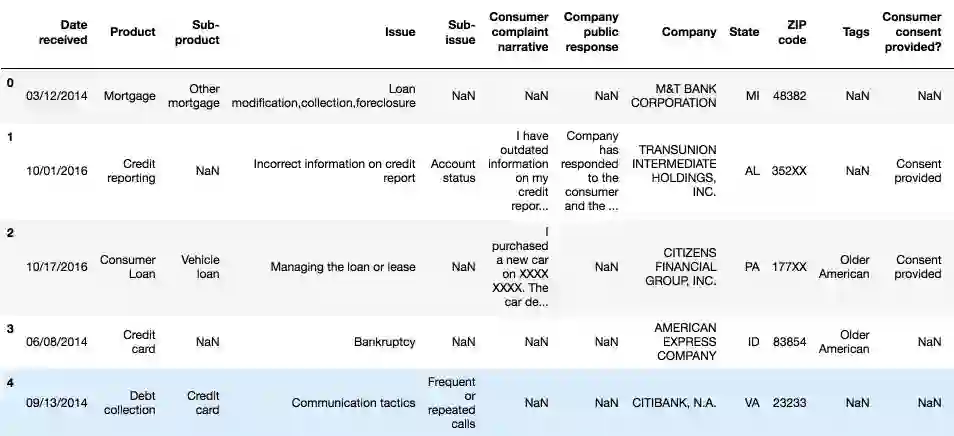 然而,互联网上绝大多数的文本分类文章和教程都是二类文本分类,如垃圾邮件过滤(垃圾邮件与非垃圾邮件),情感分析(正面与负面)。 在大多数情况下,我们现实世界的问题比这更复杂。 因此,这就是我们今天要做的事情:将消费者金融投诉分为12个预先定义的类别。 数据可以从data.gov[1]下载。