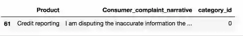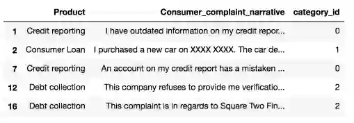 我们将删除“Consumer complaints narrative”栏中的缺失值,并添加一列来编码产品作为整数描述,因为类别变量通常比整数字符串更好。