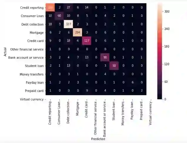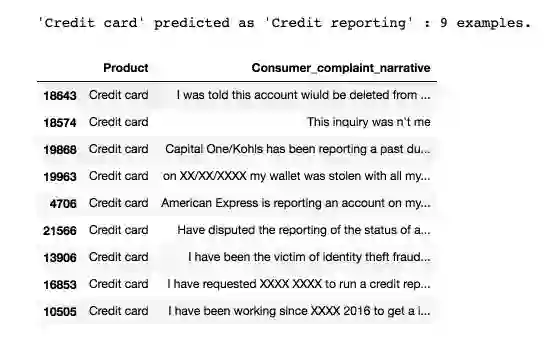 正如你所看到的,一些错误分类的文档是涉及多个主题的投诉(例如涉及信用卡和信用报告的投诉)。 这种错误会导致一些问题。