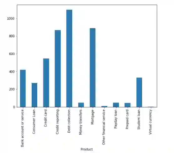 对于这个项目,我们只需要其中的两栏 - “产品”和“消费者投诉叙述(Consumer complaint narrative)”。“消费者投诉叙述(Consumer complaint narrative)作为我们的输入”,“产品”作为输出,即输入的类别
