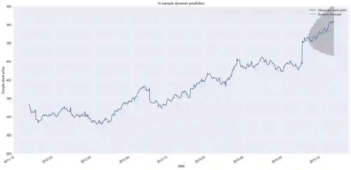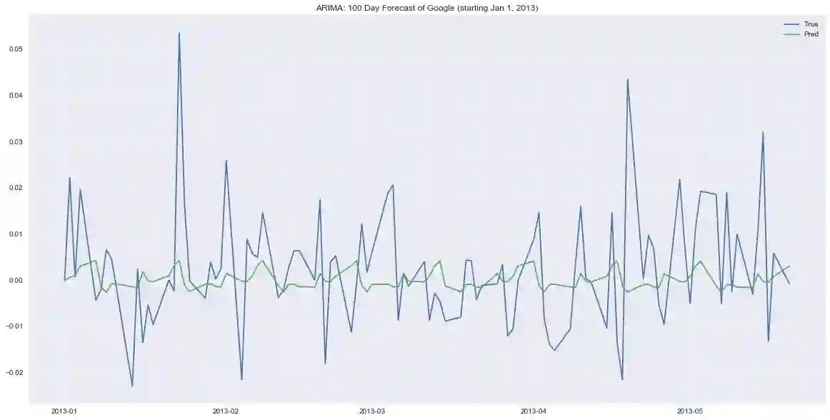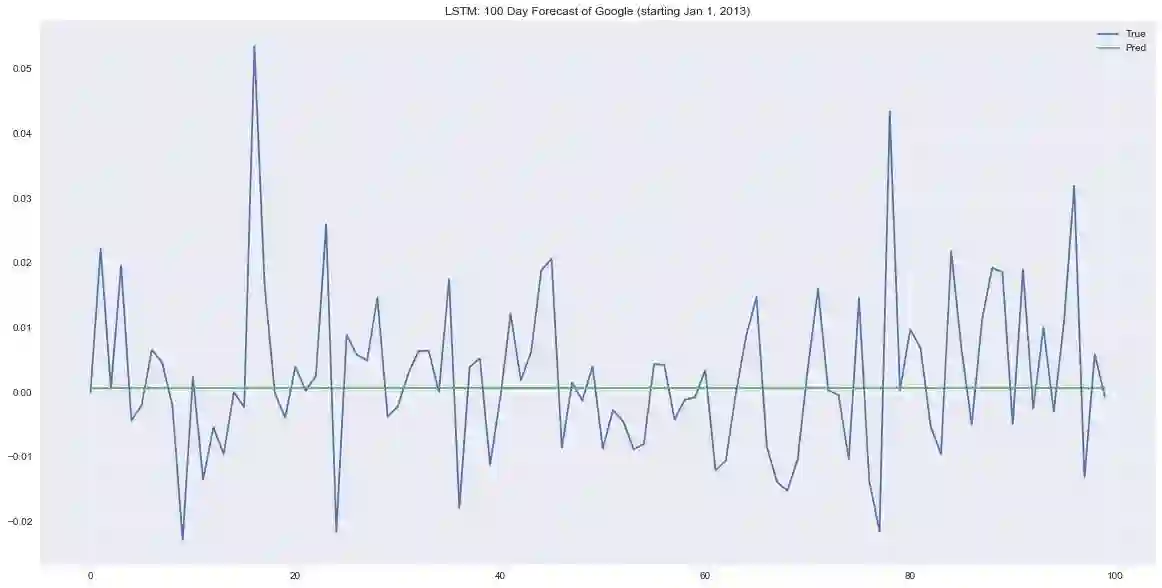 ax.set_title('LSTM: 100 Day Forecast of Google (starting Jan 1, 2013)')