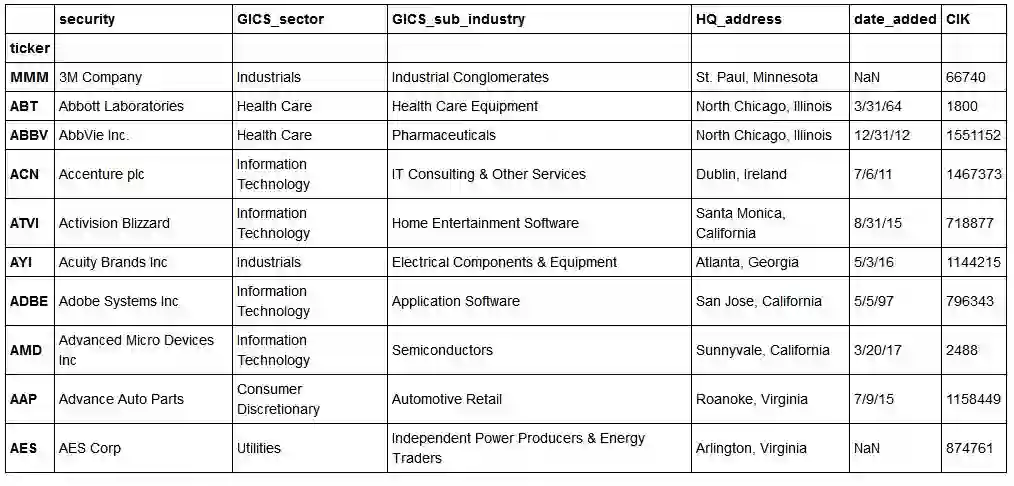 从维基百科下载的S&P 500公司信息。我们只使用股票代码列表,但GICS_sector和GICS_sub_industry等可能有用。