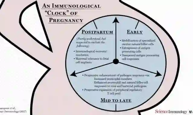 怀孕的免疫学“时钟”,突出显示怀孕期间某些时间点的关键免疫系统特征。图片来源于Science Immunology