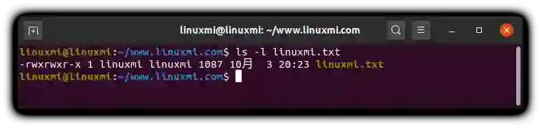 -rwxrwxr-- 1 linuxmi linuxmi 1087 10月 3 20:23 linuxmi.txt