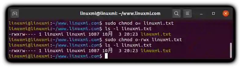 linuxmi@linuxmi:~/www.linuxmi.com$ sudo chmod o= linuxmi.txt