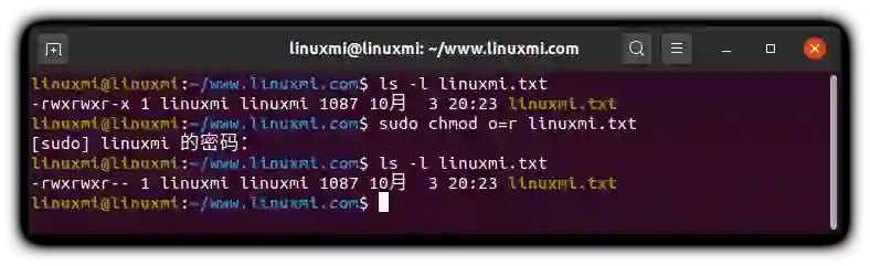 linuxmi@linuxmi:~/www.linuxmi.com$ sudo chmod o-rwx linuxmi.txt