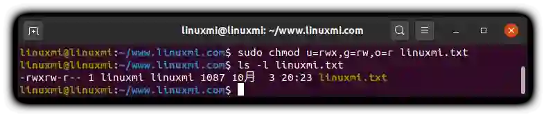 linuxmi@linuxmi:~/www.linuxmi.com$ sudo chmod o=r linuxmi.txt