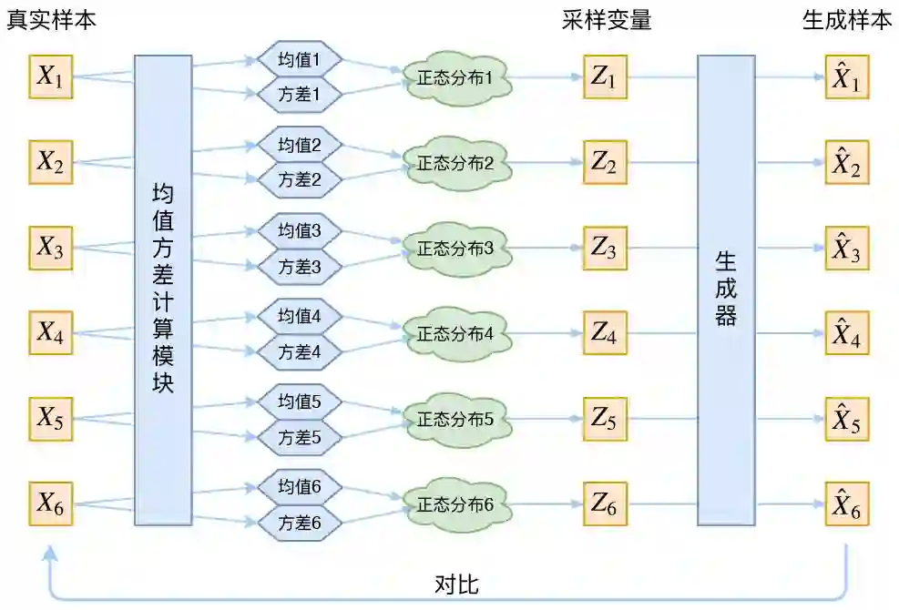 到这里,我能知道专属于 Xk 的均值和方差了,也就知道它的正态分布长什么样了,然后从这个专属分布中采样一个 Zk 出来,然后经过一个生成器得到 X̂k=g(Zk)。