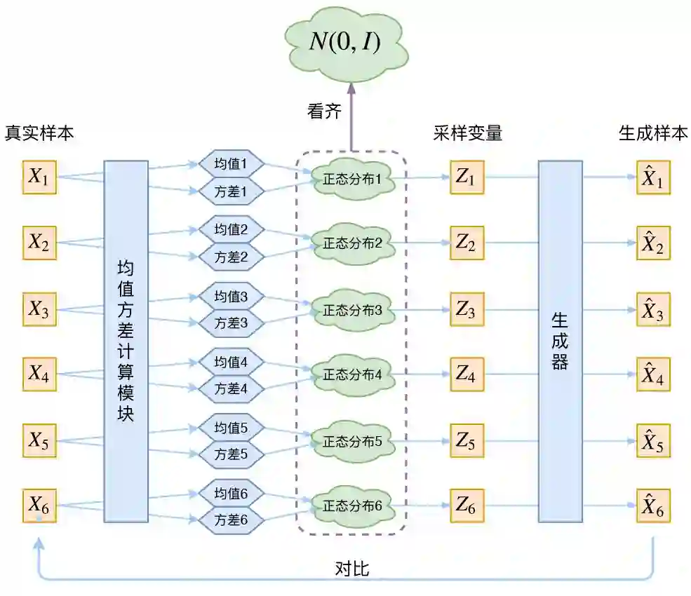 再次强调,这时候每一个 Xk 都配上了一个专属的正态分布,才方便后面的生成器做还原。但这样有多少个 X 就有多少个正态分布了。我们知道正态分布有两组参数:均值 μ 和方差 σ^2(多元的话,它们都是向量)。