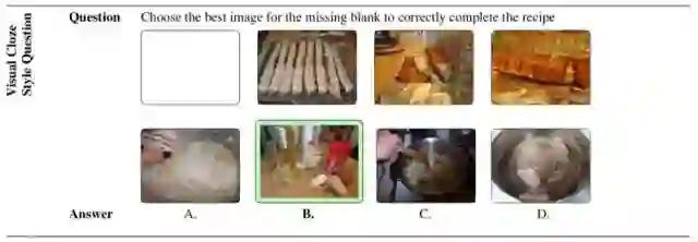 与文本完形填空任务相比,其他三个理解任务,即视觉完形,视觉连贯和视觉排序,都将配方步骤的描述作为上下文,而问题和答案仅涉及视觉模态。 为了成功完成这些任务,理解系统不仅需要理解候选步骤之间的关系,还需要调整和关联上下文和答案中存在的不同模态,或者理解一系列配方步骤的时间发生并推断时间。