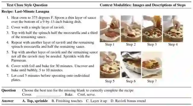 RecipeQA要求识别和链接不同形式的实体,以拥有有效和视觉上基础的推理技能。目前,多模态仅在有限的范围内进行了探索,其中大多数现有的多模态模型在整合不同模态时大多考虑非常简单的策略。