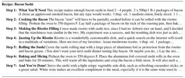 例如,让我们考虑以下'培根寿司'食谱作为输入背景。
