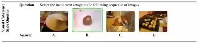 另一方面,视觉连贯问题测试了在有序图像集中识别非相干图像的能力。 以下是一个视觉连贯样式问题示例: