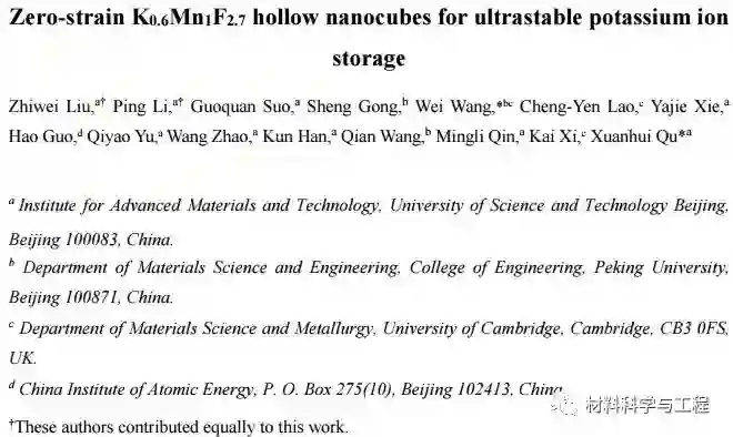近日,北京科技大学新材料技术研究院曲选辉团队在Energy & Environmental Science(IF=30.067)上发表了题为“Zero-strain K0.6Mn1F2.7 hollow nanocubes for ultrastable potassium ion storage”的论文(DOI: 10.1039/C8EE01611A),该工作报道了一种合成均匀中空KMnF-NCs的新方法,并通过控制刻蚀反应时间在晶体结构中创造缺陷与空位。