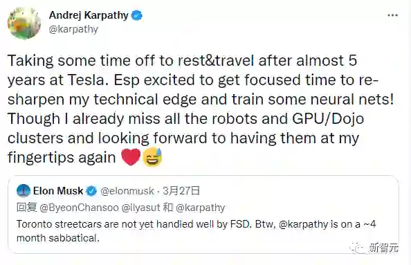 早在今年三月,Karparthy本人发推称在特斯拉工作了五年,终于抽空去休个小长假,时间大概是4个月。