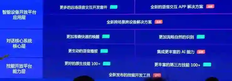 上图中,从上到下依次是DuerOS 1.0、DuerOS 2.0、DuerOS 3.0的版本及更新情况,其中绿色为升级能力、红色为更新能力。