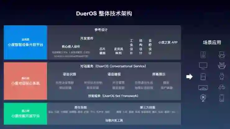 DuerOS整体架构基本可以分为三层:应用层、核心层和能力层。其中,上层为应用层,对应DuerOS的智能设备开放平台;中间层为核心层,对应DuerOS的对话系统;底层为能力层,对应DuerOS的技能开放平台。具体各层业务逻辑如下: