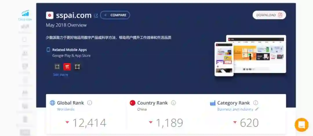 除此之外,SimilarWeb 还提供了非常详细的网站数据分析。如果你是一个网站的运营者,你也不妨在 SimilarWeb 上搜一搜自己的网站,你可以看到网站在世界、区域及同类网站间的排名、访问量及平均访问时间等非常详细的数据。在搜索相似网站的同时,这些数据也可以让你更加深入地了解你经常访问的网站。