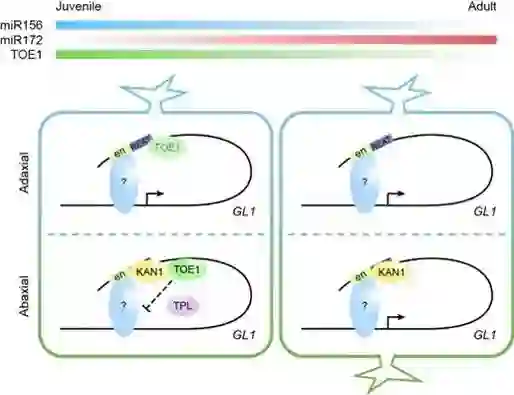 研究发现,叶片下表皮毛的发生是拟南芥进入成年期的一个标志。miR156-SPL年龄信号模块通过激活miR172的表达诱导下表皮毛的起始。miR172的靶基因蛋白AP2类转录因子(例如TOE1)与叶片极性调控因子KAN1互作。由于KAN1仅在叶片下表皮表达,TOE1仅在植物幼年期表达,因此该复合只存在于幼年期叶片的下表皮中。进一步研究发现,该复合体可以结合在表皮毛关键转录因子GL1的3’端调控序列(称为REAT)上。有趣的是,GL1座位下游的增强子可以与5’端启动子形成染色质环,启动GL1的表达。因此,在植物幼年期叶片的下表皮中,TOE1-KAN1复合体可以借助染色体环靠近GL1启动子,抑制其表达,导致叶片下表皮毛不能发生。当植物进入成年期后,由于miR156-SPL信号模块的增强,miR172表达升高,导致TOE1蛋白含量降低,此时TOE1-KAN1复合体逐渐解离,从而释放它对GL1的抑制作用,诱发下表皮毛的产生。
