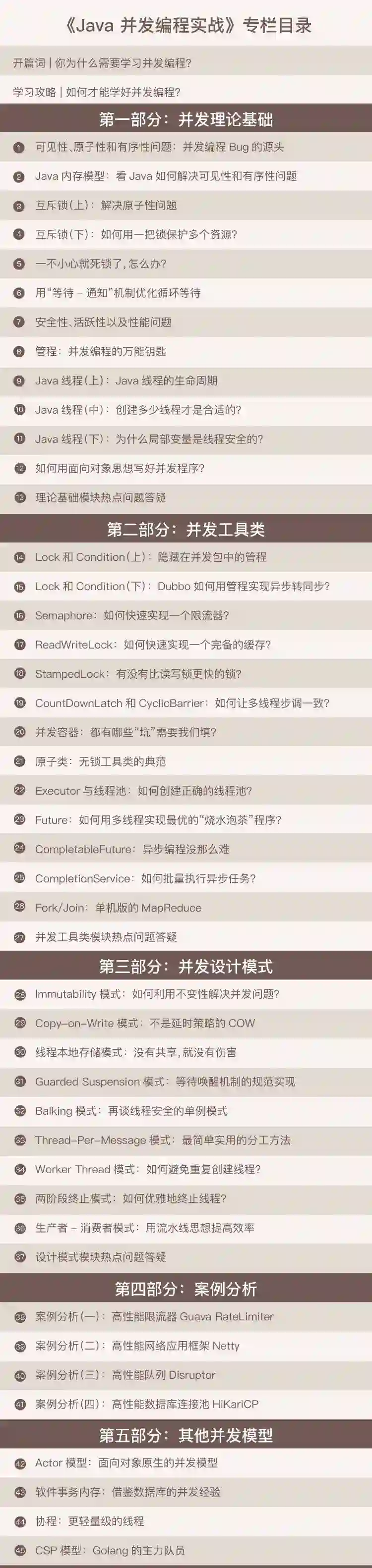 更值得关注的是,王宝令在极客时间开设了《Java并发编程实战》专栏,专栏中,会站在理论、模型的角度讲解Java并发,全面系统的并发编程知识体系,帮助大家得心应手地解决各种并发难题。