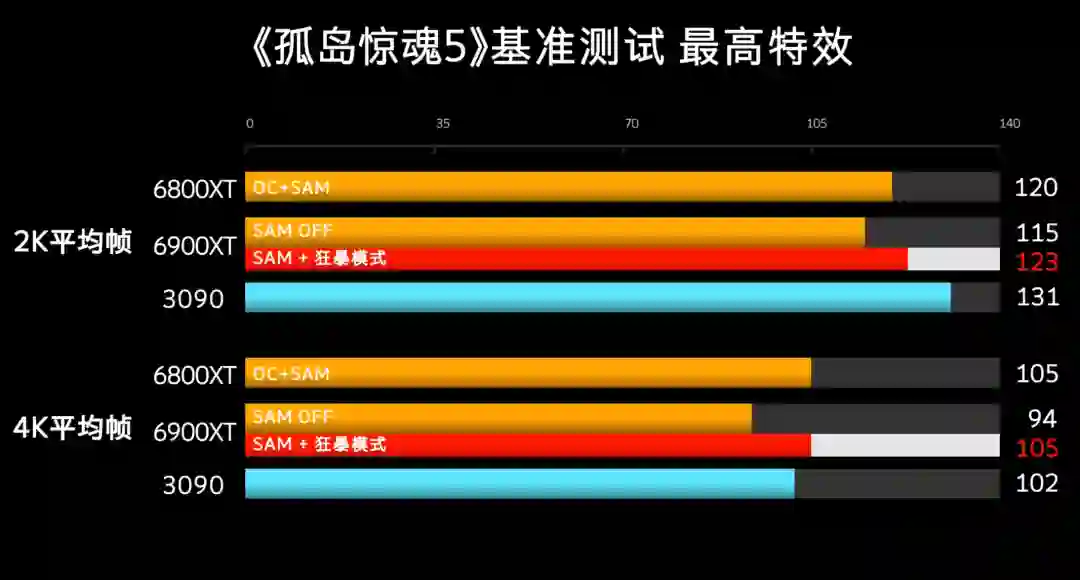 同是育碧的孤岛惊魂5,互有胜负,超频后的6800XT 4K帧数和6900XT一样。