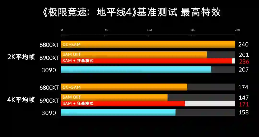 地平线4,AMD这边加上SAM之后全面领先,超频后的6800XT拔得头筹。