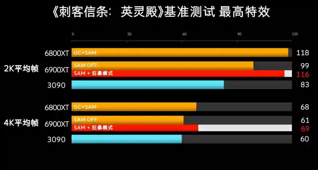 刺客信条英灵殿这边扳回一城,SAM的收益非常大,4K分辨率下收益也不错,能让帧数尽量保持在60以上。