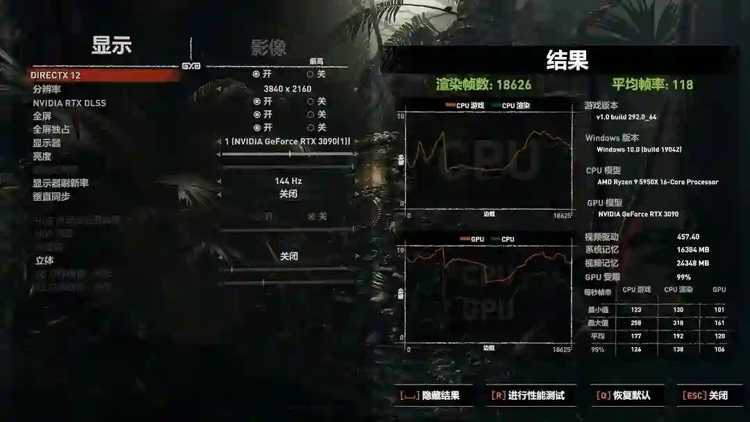 游戏测试,惯例古墓丽影暗影,3款显卡差距都不是特别大,3090这边4K帧数高一些,再加上大力水手的加持,爽玩4K120帧不是梦,希望AMD类似的功能能尽快应用起来。