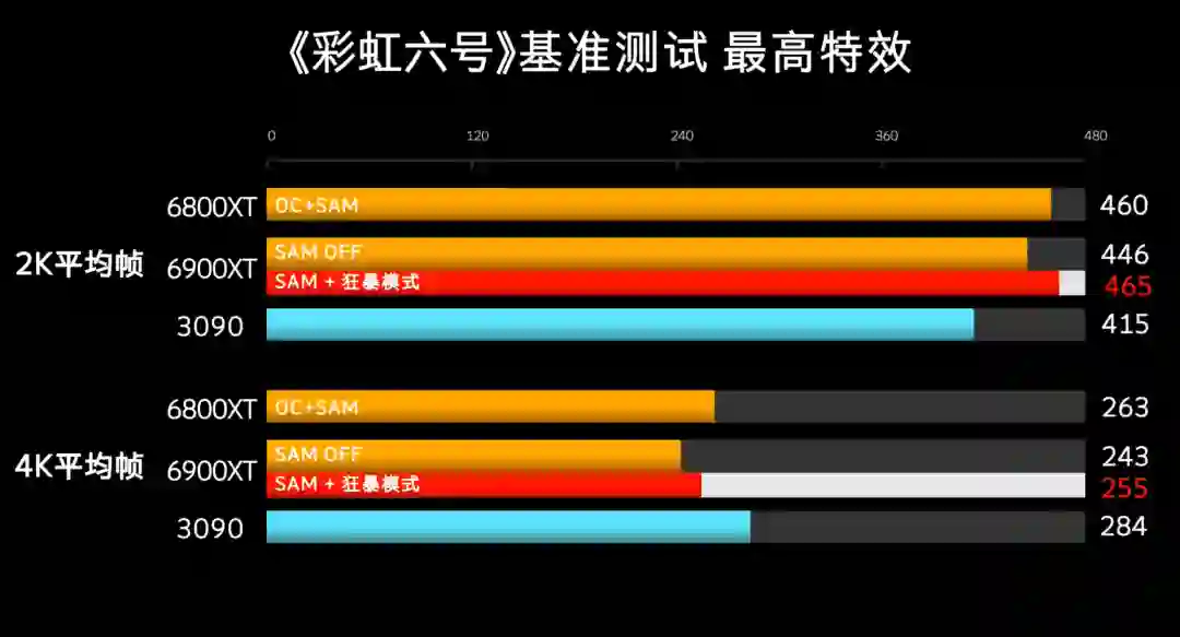 竞技游戏彩虹六号,这边6900XT开启SAM之后的收益就非常大了,2K涨了19帧,但4K分辨率下略显疲软,甚至还没比过超频后的6800XT小老弟。