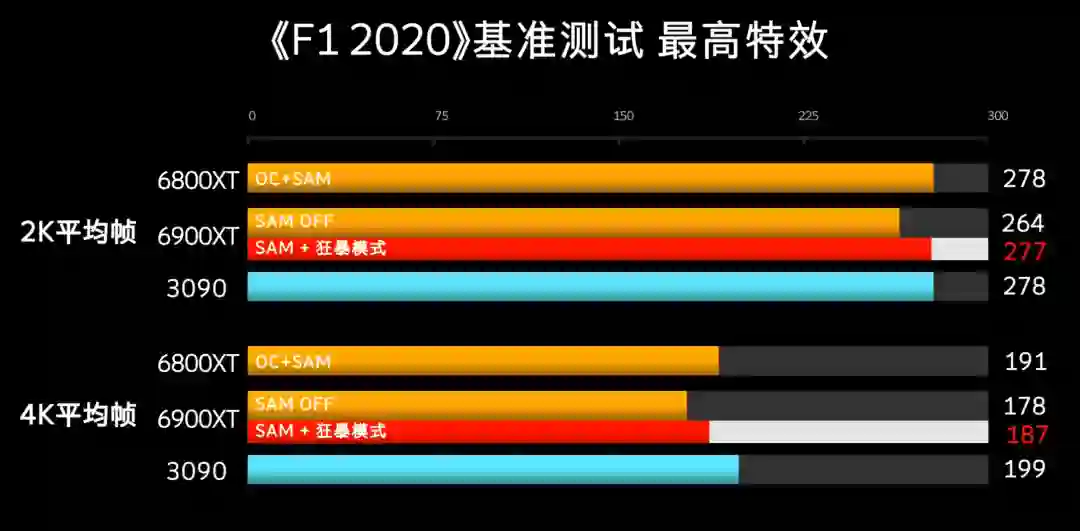 接下来要记得6800XT只要3090一半的售价这件事,F1 2020,超频后的6800XT和3090一个平均帧,4K差少少。